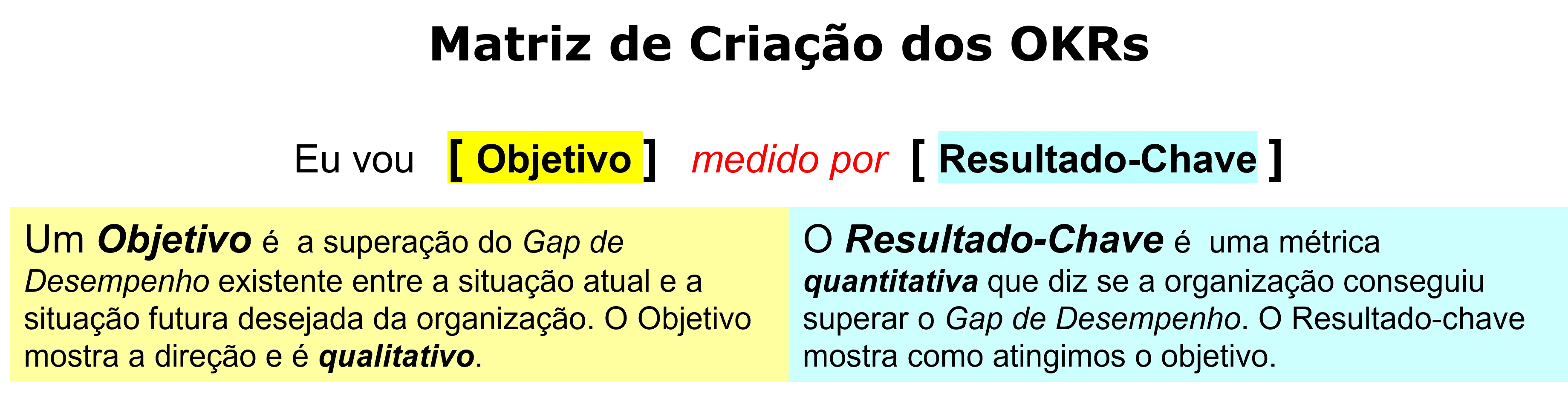 É importante ressaltar que para a implementação dos OKRs não existe uma fórmula mágica, ou uma única maneira de se fazer. Porém, apresentamos a seguir, o que pode ser denominado como a matriz de criação dos OKRs (Objetivos e Resultados-Chave).